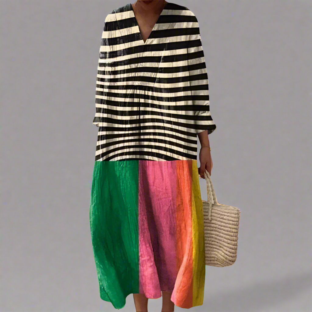 Découvrez l'art et l'élégance avec notre robe géométrique Gabriela, l'un de nos produits les plus appréciés. Ce design moderne se marie avec un charme intemporel, caractérisé par des motifs inspirés des rêves qui attirent l'attention. La silhouette fluide met en valeur chaque silhouette, garantissant confort et style pour chaque occasion spéciale ou pour élever votre look quotidien.