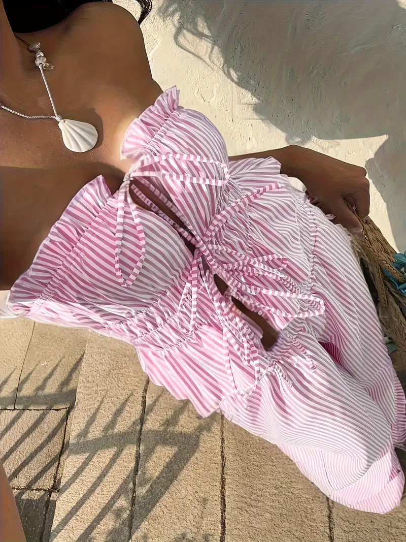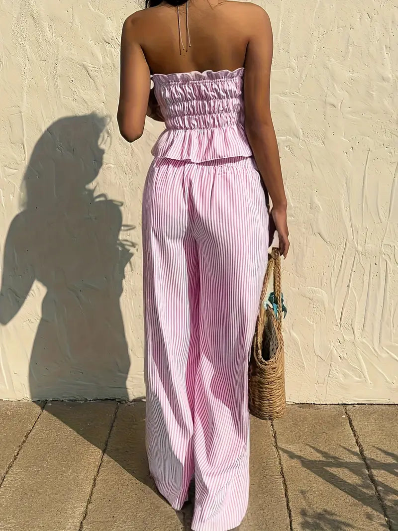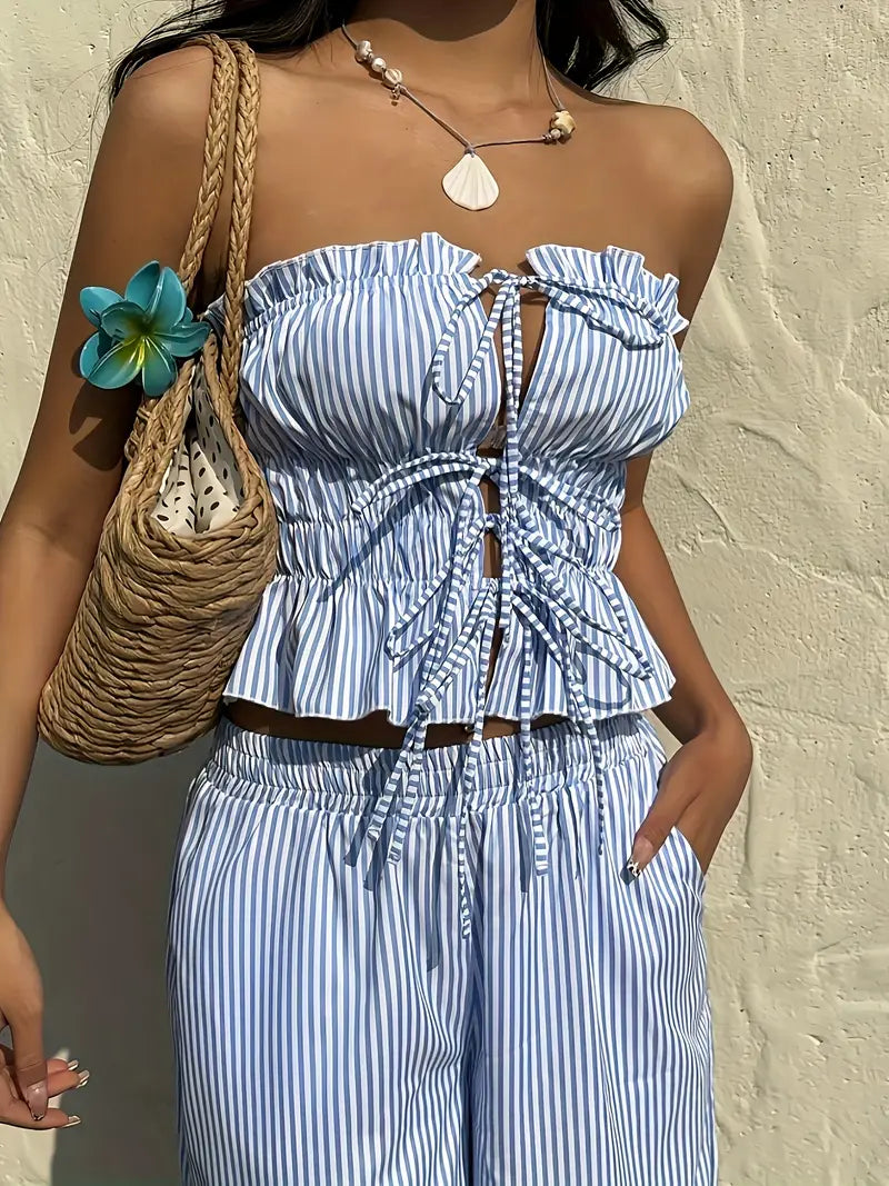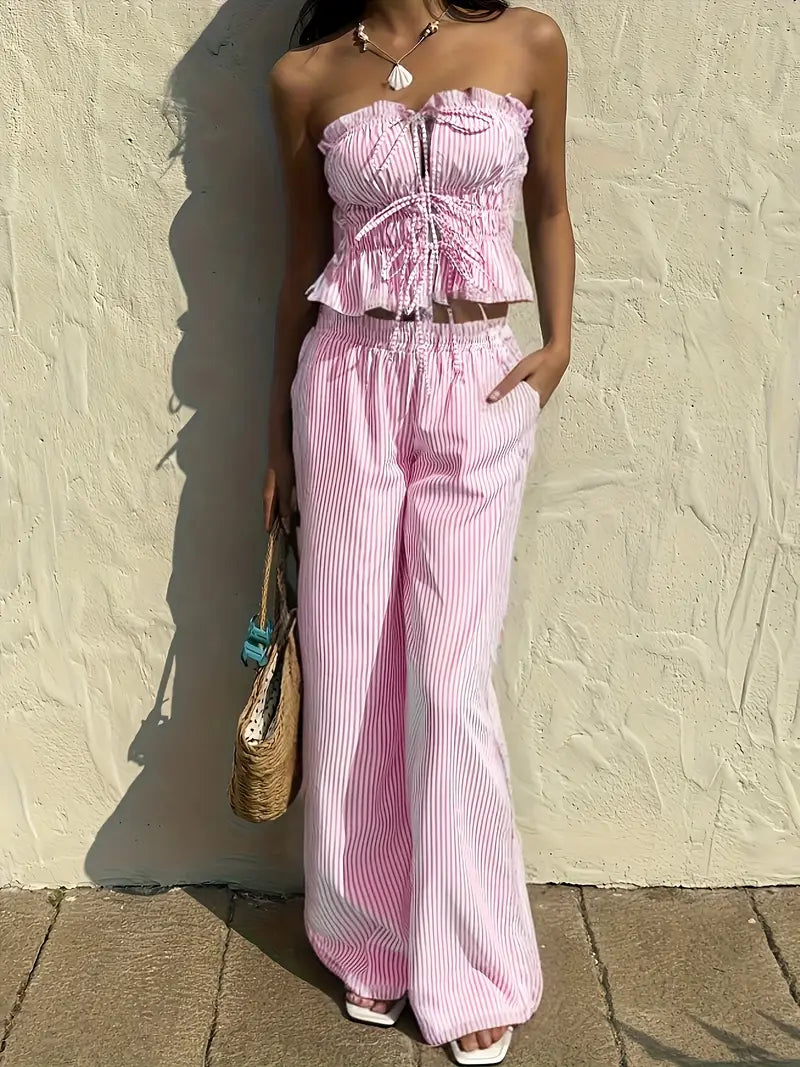 Cet ensemble d’inspiration coréenne combine un haut bustier à volants noué et un pantalon taille haute fluide pour un style à la fois chic et détendu. Sa coupe légère sans manches te permet de rester au frais tout en affirmant ton style avec confiance. Parfait pour les vacances, les sorties entre amies ou une promenade en ville sous le soleil.